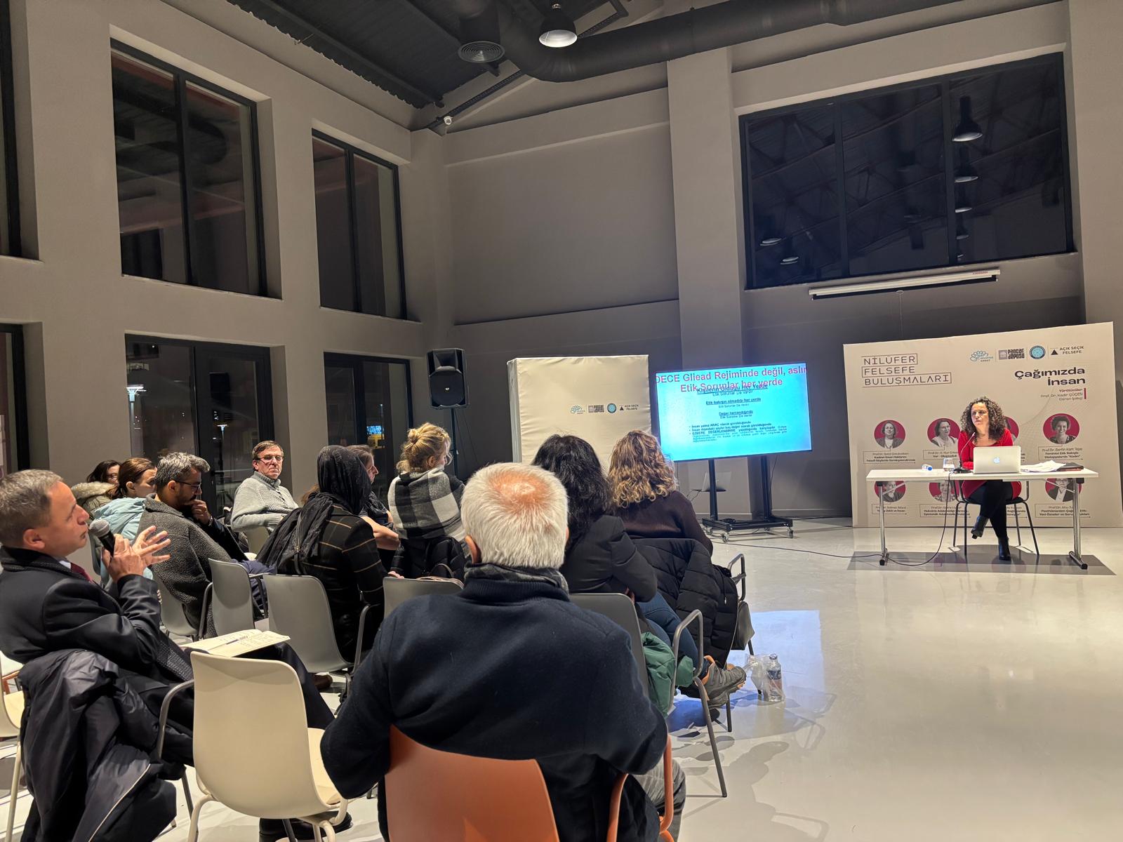 Nilüfer Belediyesi’nin düzenlediği “Nilüfer Felsefe Buluşmaları”na Prof. Dr. Berfin Kart Tepe konuk oldu. Pancar Deposu’nda gerçekleştirilen Ocak ayı söyleşisinde, “Feminist Etik Bakışla Distopyalarda Kadın” başlığı ele alındı.
