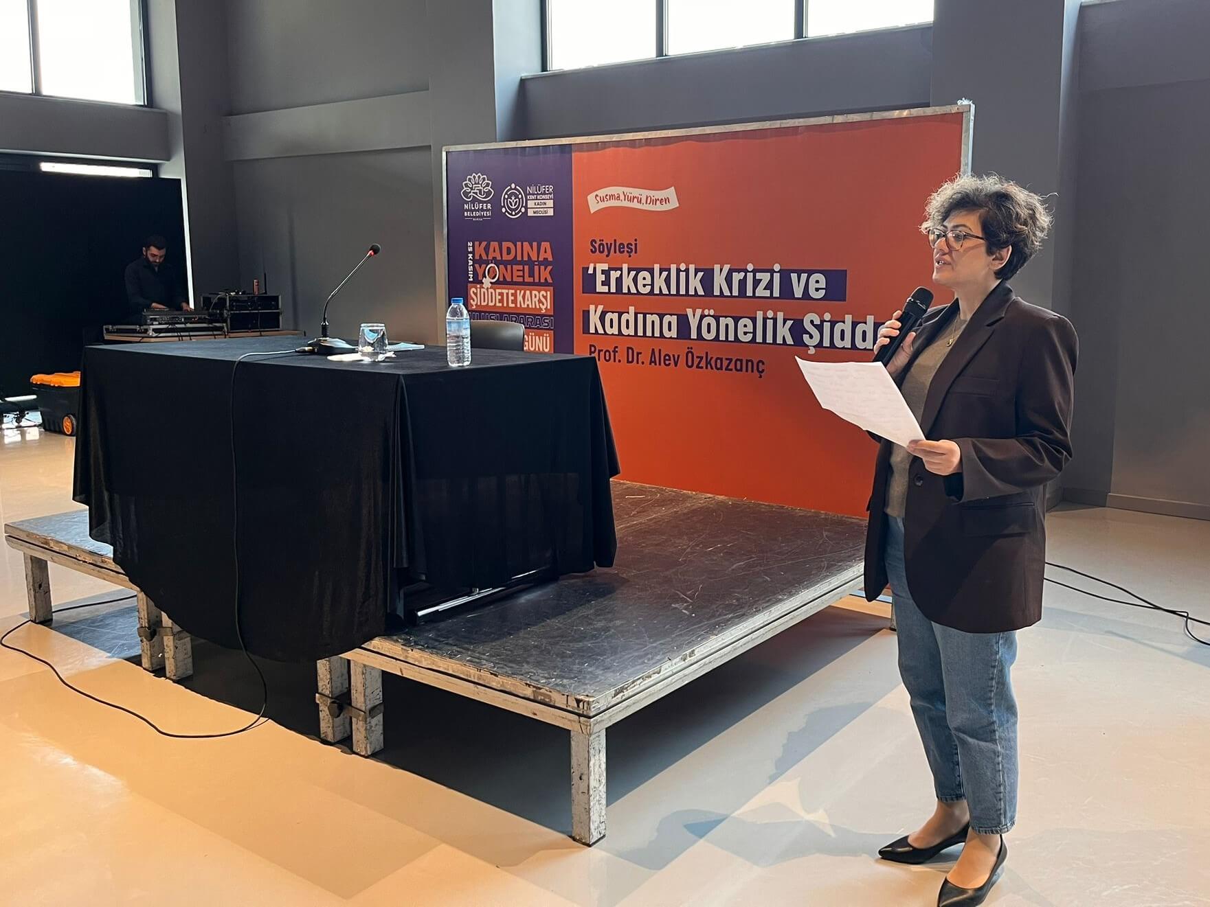 Nilüfer Belediyesi’nin ‘25 Kasım Kadına Yönelik Şiddetle Mücadele Günü’ kapsamında düzenlediği söyleşide konuşan Siyaset Bilimci ve Yazar Prof. Dr. Alev Özkazanç, erkekliğin toplumsal kökenlerindeki krizin, şiddetle ilişkisini ele aldı.