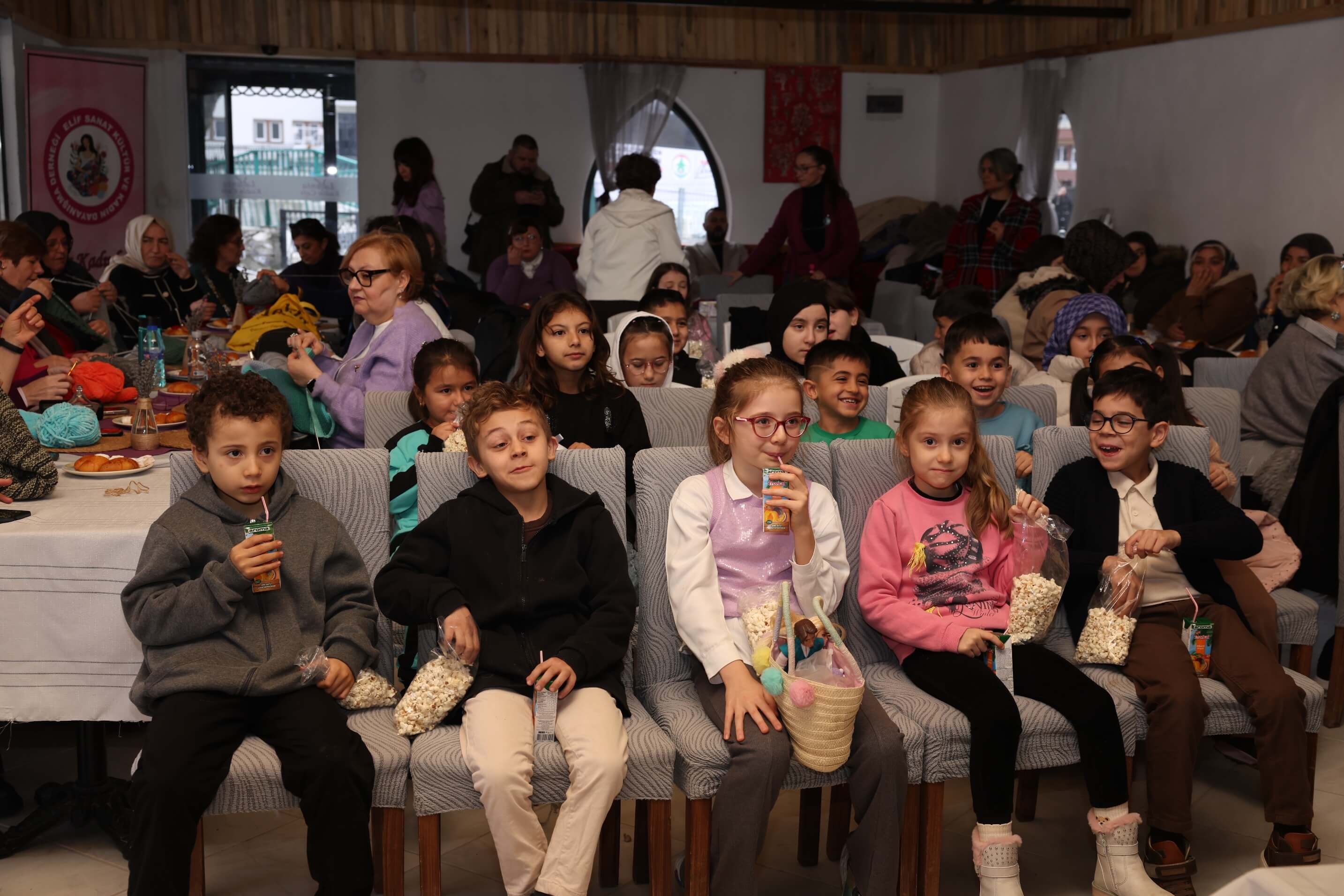 Gülözü Mahallesi’nden kadınlar ve çocukların da katıldığı etkinlikte, “Bursa Bülbülü” filmi izlenirken kadınlar yeni iyilik hareketleri için örgü örmeyi sürdürdü.