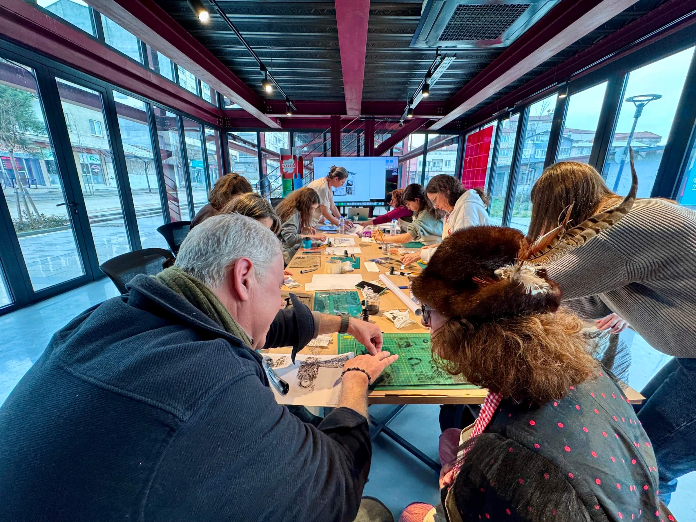 Pancar Deposu’nda gerçekleşen atölyede, gündelik hayatta sıkça kullanılan ofis malzemelerinin sanatsal bir ifade araca dönüşme olanakları ele alındı. Burcu Güven eşliğinde çalışmalar yapan katılımcılar; geçirgenlik, iz, tekrar ve dönüşüm kavramları üzerine yoğunlaştı. Şeffaf bant ve mürekkep kullanılarak yapılan çalışmalarda, malzemelerin sınırları zorlanarak katmanlı dokular elde edildi. Katılımcılar bu süreçte hem teorik bir tartışma ortamı buldu hem de malzemeyle doğrudan ilişki kurarak kendi üretimlerini gerçekleştirdi.