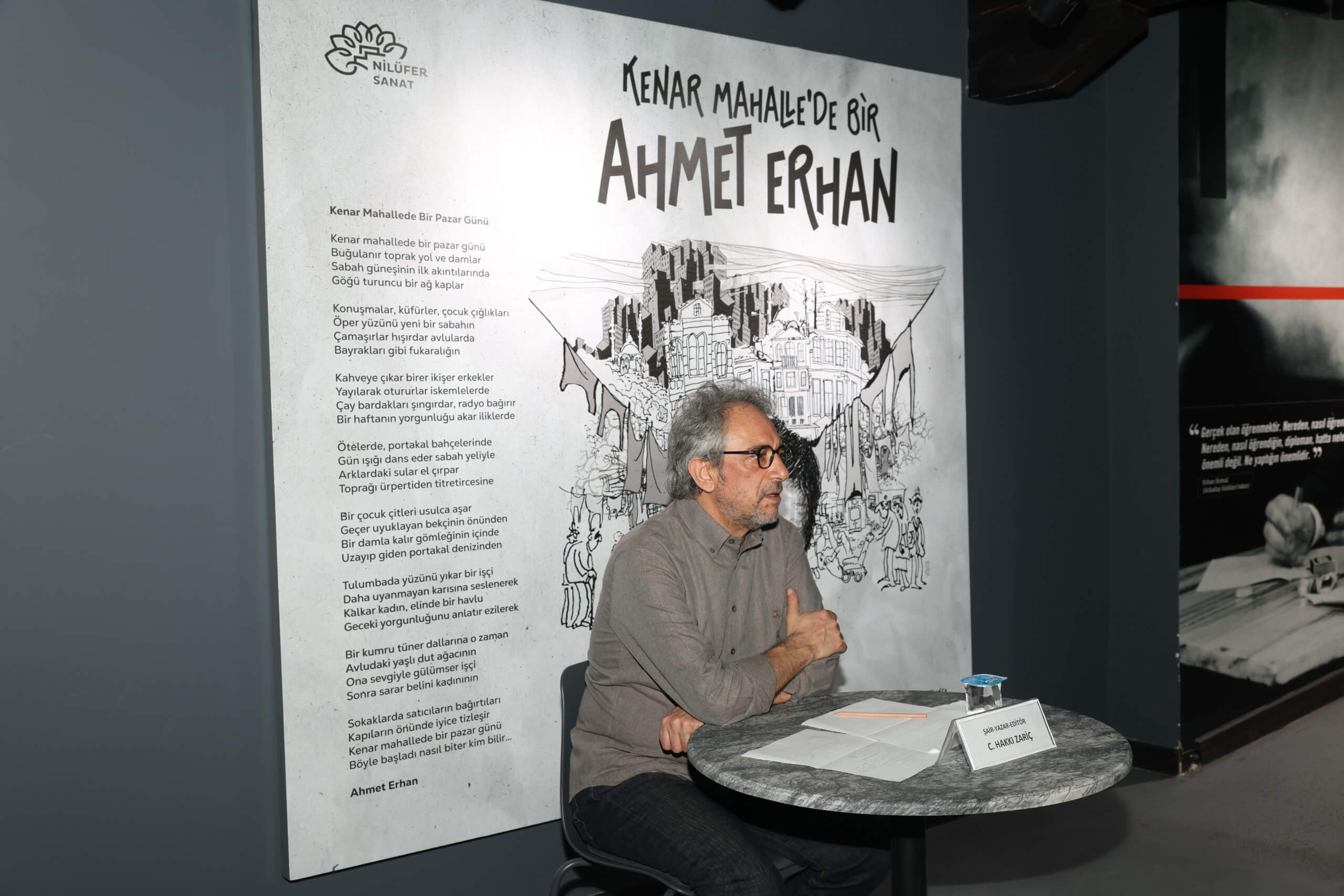 Bursa’da yaşayan yazar, şair ve edebiyatseverlerin ilgi gösterdiği serginin açılışında C. Hakkı Zariç de bir söyleşi gerçekleştirdi. Zariç, Ahmet Erhan’ın Ankara ile özdeşleşmiş bir şair olarak bilinmesine rağmen, köken ve kimlik olarak aslında tam bir Akdenizli olduğunu vurguladı. Erhan’ın şiirlerindeki Akdeniz lirizmine dikkat çeken Zariç, şairin “Alacakaranlıktaki Ülke” kitabıyla başlayan ve 12 Eylül döneminin zorlu koşullarında filizlenen edebiyat serüvenini katılımcılarla paylaştı.